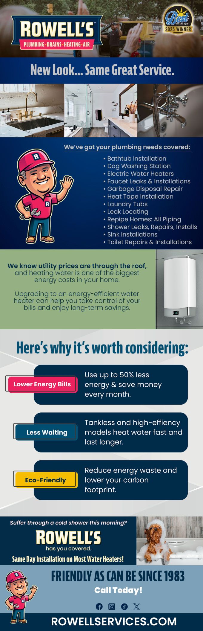 "Friendly As Can Be Since 1983!" When you need help with your plumbing, drains, heating, cooling or electrical in Manchester, you can always rely on Rowell's Services! Call us now or book online!